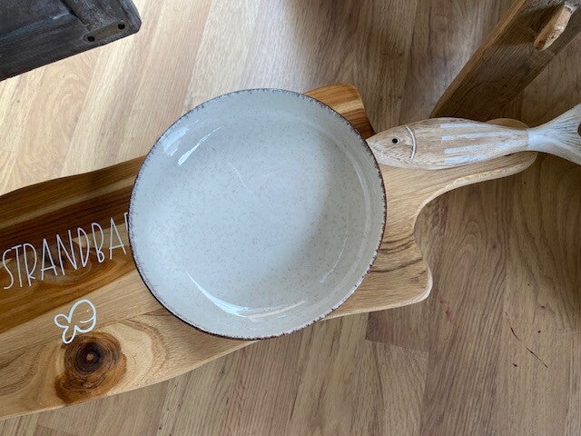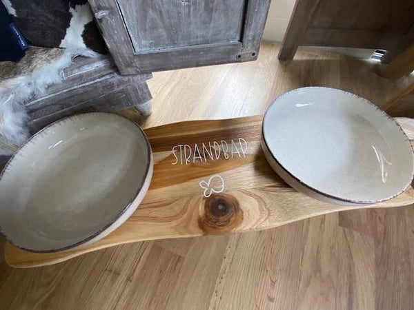 Futterbar bestehend aus einem wunderschönen Akazienholzbrett, 2fach mit Hartwachsöl behandelt, individuellen Füssen aus Teakholz mit toller Maserung, 2 hübschen Keramikschalen (à 500 ml) in beige und einem großen Deko-Holzfisch.