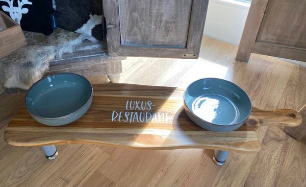 Futterbar bestehend aus einem wunderschönen Akazienholzbrett, 2fach mit Hartwachsöl behandelt, schlichten grauen Metallbeinen (höhenverstellbar) und 2 hübschen Keramikschalen (à 350 ml) in blaugrau.