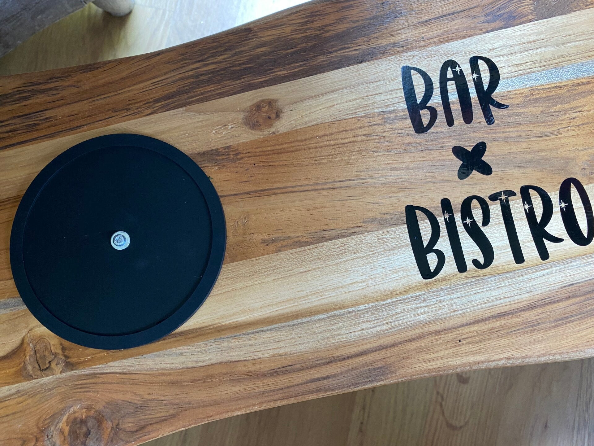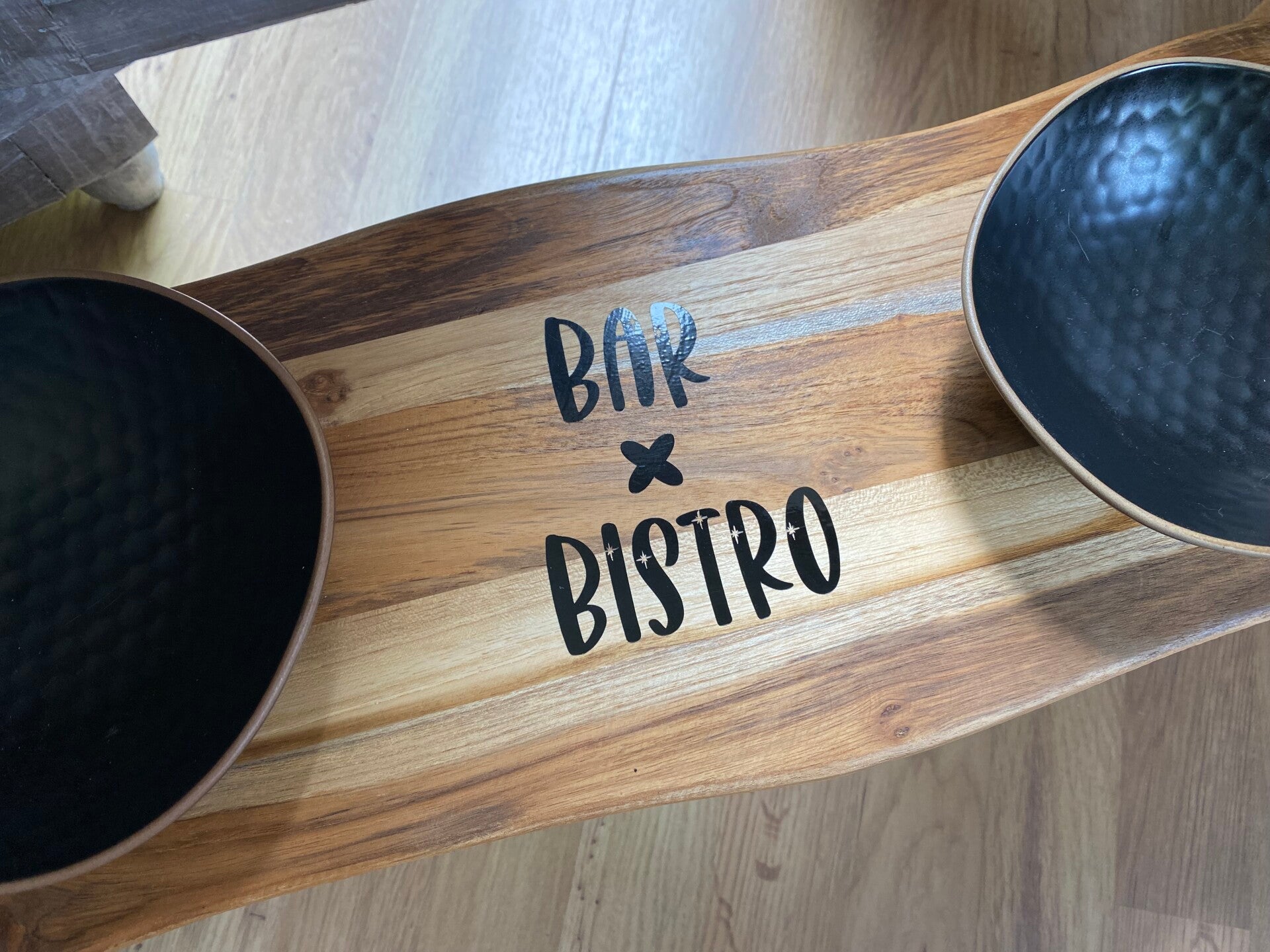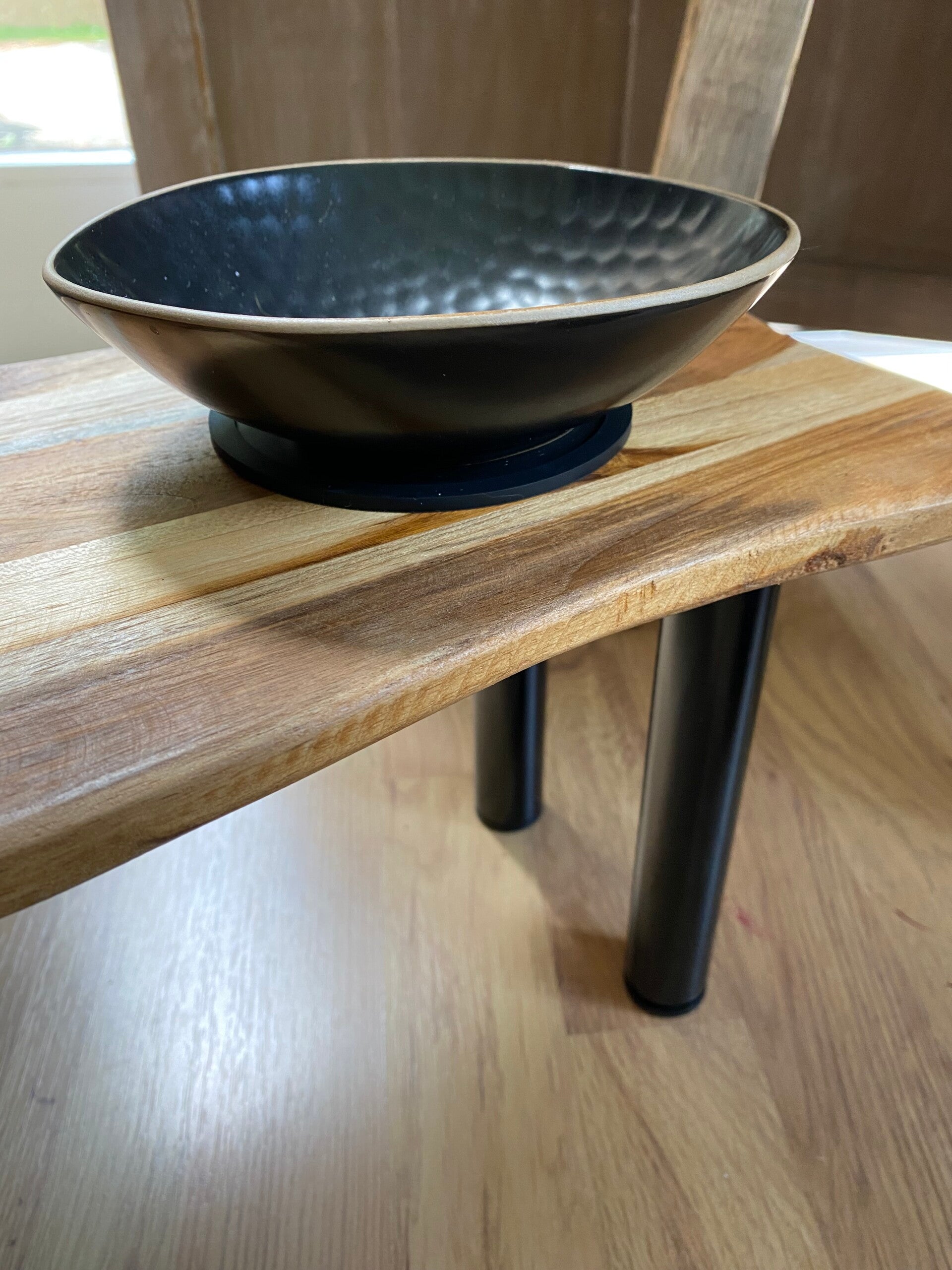 Futterbar bestehend aus einem wunderschönen Akazienholzbrett 2fach mit Hartwachsöl behandelt, schlichten schwarzen Metallfüssen (20 cm Höhe) -höhenverstellbar- und 2 hübschen Keramikschalen in schwarz (à 350 ml, Durchmesser ca.15 cm).