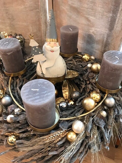 Adventskranz „Edler Santa" mit grauen Kerzen, Kerzenhalterring in gold, Weihnachtsmann aus Metall, Teller gold, außergewöhnlichen goldenen Trockenfrüchten und Kugeln in gold & grau. Sehr schick und edel!