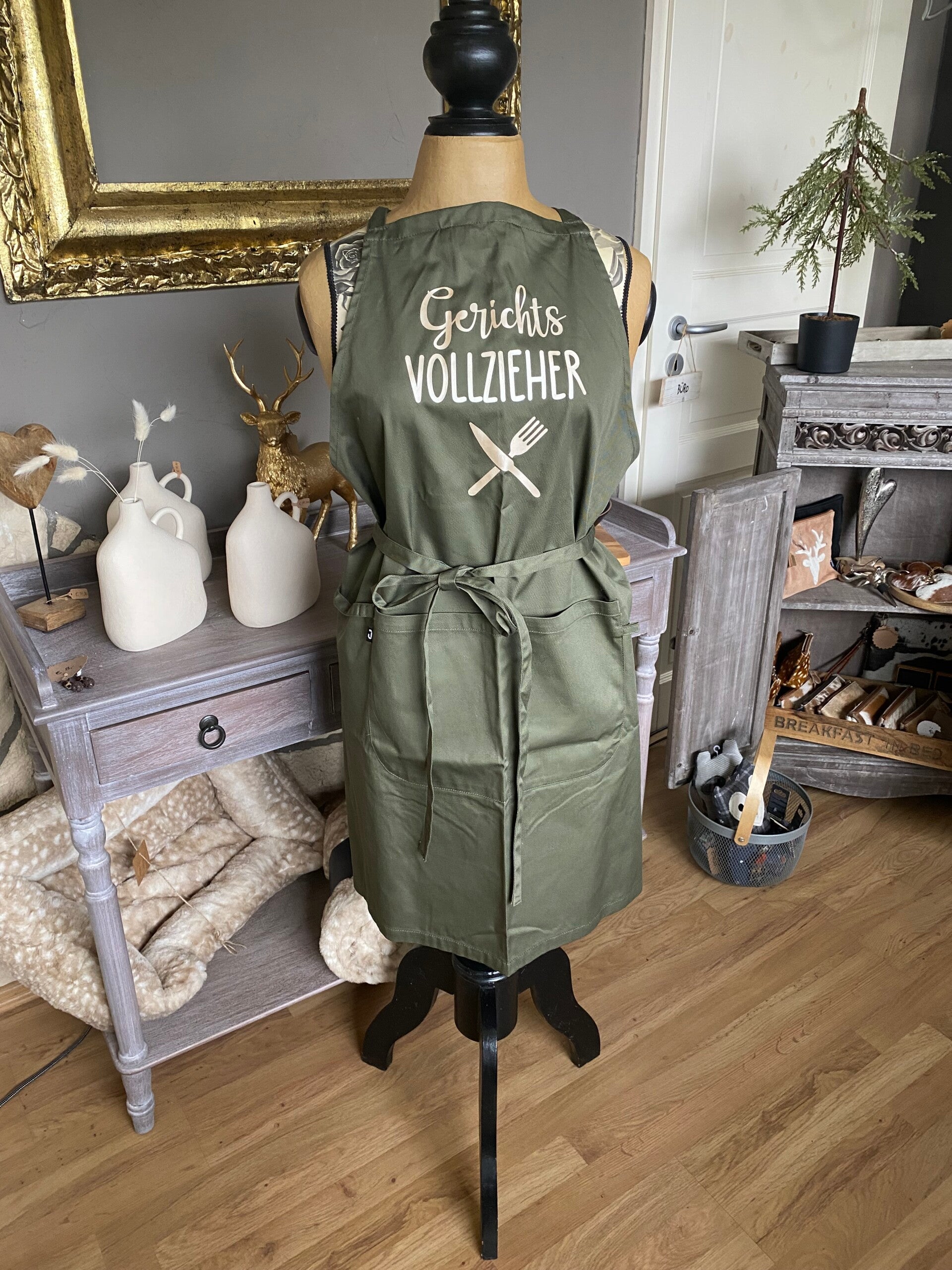 Hochwertige Latzschürze "Gerichts Vollzieher" mit gekreuzten festen Stoffbändern aus Schürzenstoff, zweigeteilter Vordertasche, Stifttasche und Geschirrtuchschlaufe.