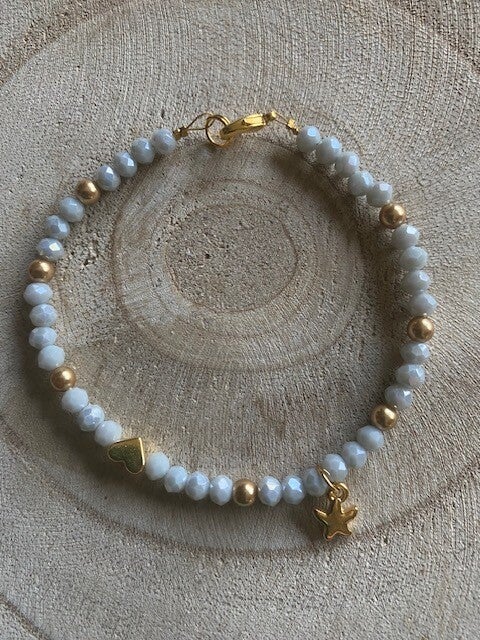 Einreihiges Armband bestehend aus schimmernden, graublauen Perlen, Original-Swarovskiperlen in vintage gold 4 mm,Seestern und Herz gold. Mit Karabinerverschluss goldfarben.