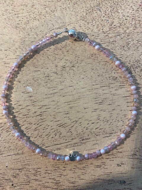 Einreihiges Armband bestehend aus schimmernden, rosafarbenen Crystalperlen, Original-Swarovskiperlen in pearl rosa 3 mm und Metallkrone. Mit Magnetverschluss.